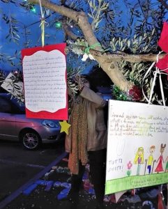 Un messaggio ecumenico aperto a tutti senza fare distinzioni e discriminazioni…. Solo gli “Attenti” ai segni dei tempi riescono a percepirne la voce e coglierne il significato. E “beati” coloro che, sull’esempio di questi 2 bimbi, Alessandro e Leonardo, della scuola primaria di Via Volturno, giorni fa sostando spontaneamente presso la “Panchina della Pace e della Nonviolenza” ci hanno declamato il messaggio impegnato del Natale deposto ai piedi dell’Albero della Pace, si soffermano a loro volta spontaneamente ( senza vergognarsi o passare indifferenti…) davanti a questo “Simbolo” silente della memoria senza tempo, che veglia sull’intera Comunità nel segno della “Fiaccola” che deve ardere nel cuore di ogni uomo e di ogni donna di buona volontà; perché chiunque opera per la Pace è figlio di Dio…
