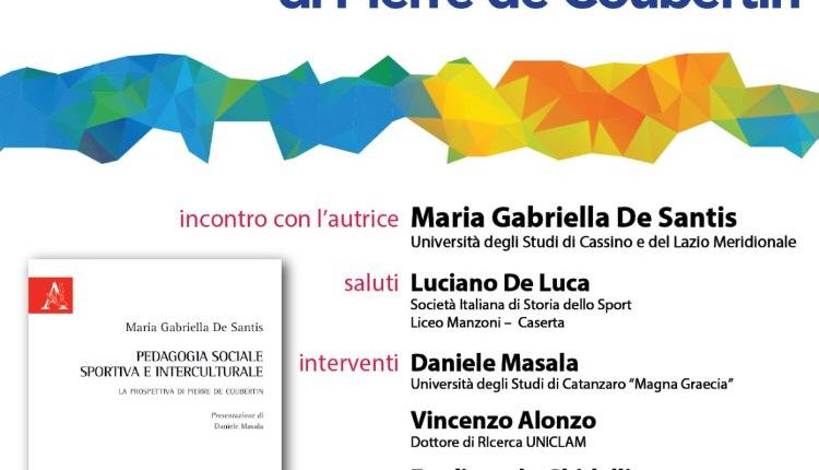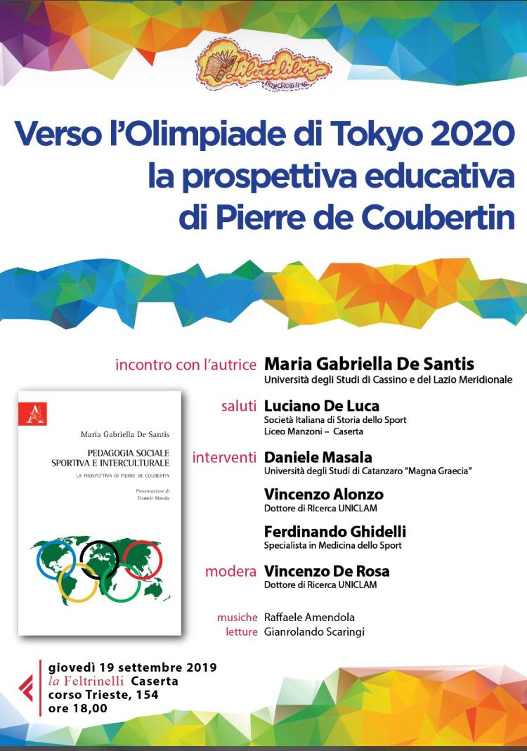 CASERTA – Giovedì, 19 settembre 2019, con inizio alle ore 18.00, presso la libreria “la Feltrinelli” sita in Corso Trieste nr. 154 a Caserta, si terrà il Convegno dal titolo: “Verso l’Olimpiade di Tokio 2020, la prospettiva educativa di Pierre de Coubertin”. L’evento è organizzato dall’Associazione culturale “LiberaLibri” di Caserta che ne discute con l’autrice del libro: “Pedagogia sociale, sportiva e interculturale. La prospettiva di Pierre de Coubertin” dr.ssa Maria Gabriella DE SANTIS dell’Università degli Studi di Cassino e del Lazio Meridionale.