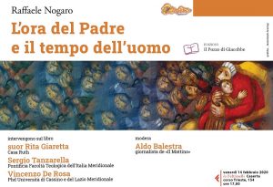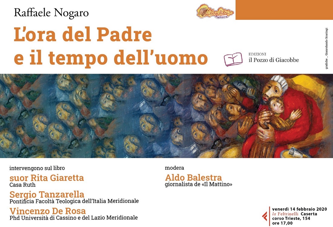 Venerdì, 14 febbraio 2020, alle ore 17:00, presso la libreria “la Feltrinelli”, Corso Trieste nr. 154 a Caserta, l’Associazione culturale casertana “Liberalibri” presenterà l’ultimo lavoro di Monsignor Raffaele NOGARO dal titolo: “L’ora del Padre e il tempo dell’uomo”, edito da “il Pozzo di Giacobbe”. Interverranno alla presentazione del libro: suor Rita GIARETTA di Casa Ruth di Caserta, Sergio TANZARELLA della Pontificia Facoltà Teologia dell’Italia Meridionale e Vincenzo DE ROSA, dottore di Filosofia dell’Università di Cassino e del Lazio Meridionale. A moderare gli interventi è stato chiamato Aldo BALESTRA, giornalista de “Il Mattino”