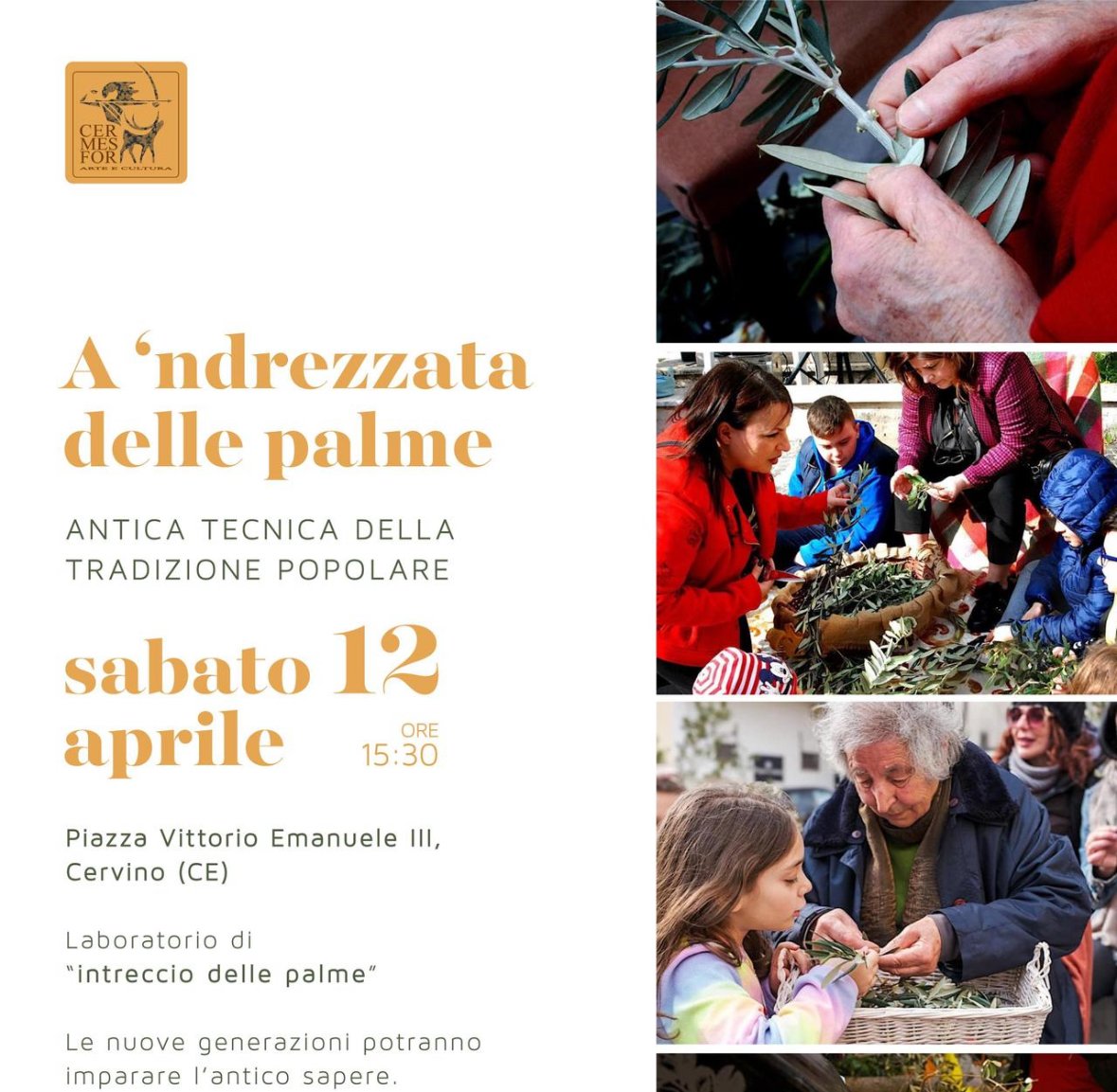 Cervino – Sabato 12 aprile, a partire dalle ore 15:30, Piazza Vittorio Emanuele III a Cervino (CE) sarà teatro di un evento speciale: “A ‘ndrezzata delle palme”. Si tratta di un laboratorio dedicato all’antica tecnica dell’intreccio delle palme, una tradizione popolare che si tramanda di generazione in generazione.