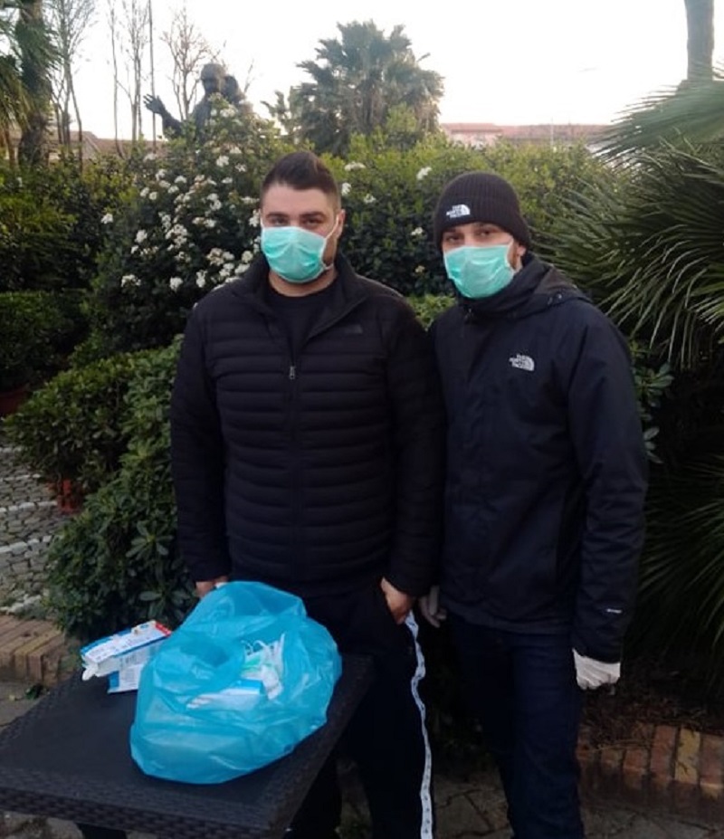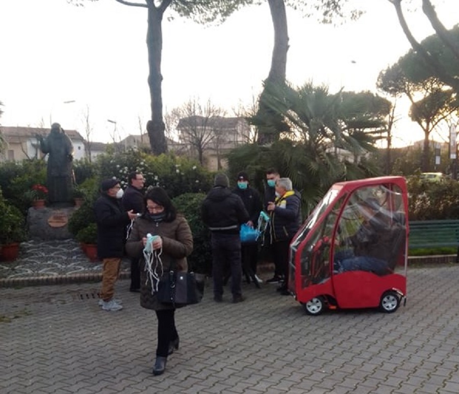 Tre giovanissimi di San Nicola la Strada: Emanuele LETIZIA, Pietro ZAMPELLA e Andrea SIMPATICO all’interno della Rotonda (lato Est), di fianco alla statua di Padre Pio, hanno voluto donare gratuitamente cento mascherine e cento gel disinfettanti per le mani alle persone anziane ed alle persone che ne necessitano, fino ad esaurimento scorte.