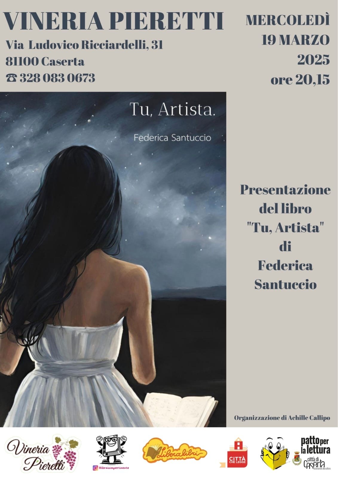 Mercoledì 19 marzo 2025 alle ore 20,15, la Vineria Pieretti in via Ludovico Ricciardelli 31 a Caserta ospiterà la presentazione del libro “Tu, artista” di Federica Santuccio. L’evento è organizzato da Achille Callipo, il “Libraio Impertinente”, per conto dell’associazione Liberalibri, in collaborazione con Armida Daniela Pieretti, titolare della vineria, nell’ambito del Patto per la Lettura Caserta Città che Legge.