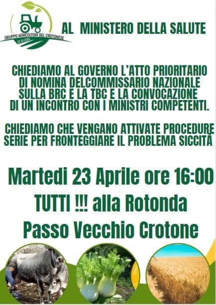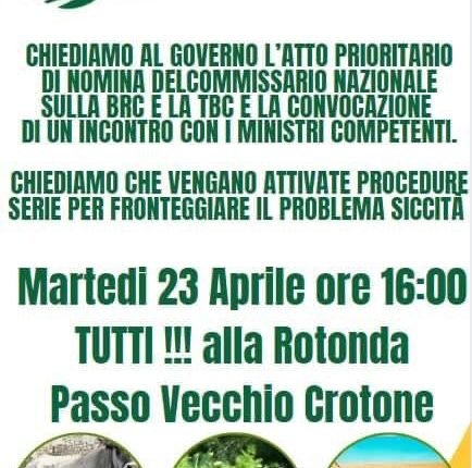 Intanto i territori stanno già mettendosi in campo con manifestazioni. Domani, 23 aprile, gli allevatori Calabresi si sono convocati in manifestazione a Crotone alle ore 16 (alla Rotonda Passo Vecchio). Chiare e inequivocabile le loro richieste: “Chiediamo al Governo l’atto in Via Prioritaria di nomina del Commissario di Governo sulla BRC e la TBC oltre che a misure urgenti per fare fronte alla siccità”. Le stesse richieste per cui è in atto lo sciopero della fame a Roma; cosi anche la Calabria, dopo il Molise, la Campania e la Sicilia si aggiunge alla vertenza per la nomina del Commissario Nazionale.