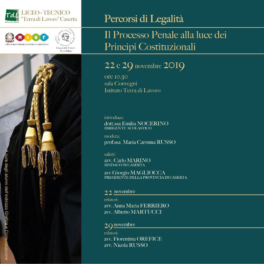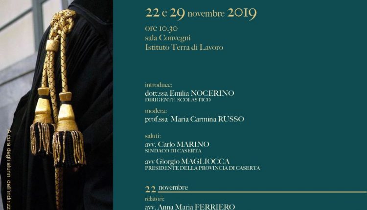 Nell’ambito dei “Percorsi di Legalità”, all’Istituto “Terra di Lavoro”  venerdì 22 novembre e venerdì 29 novembre con inizio alle ore 10.30 nell’aula Magna si svolgeranno due incontri che avranno come tematica “ Il Processo Penale alla luce dei principi Costituzionali”. Ad entrambi gli eventi introdotti dalla Preside Emilia Nocerino e moderati dalla prof.ssa Maria Carmina Russo interverranno il Sindaco di Caserta avv. Carlo Marino e il Presidente della Provincia avv. Giorgio Magliocca. Venerdì 22 novembre relatori saranno gli avvocati Anna Maria Ferriero e Alberto Martucci, venerdì 29 novembre gli avvocati Fiorentina Orefice e Nicola Russo.