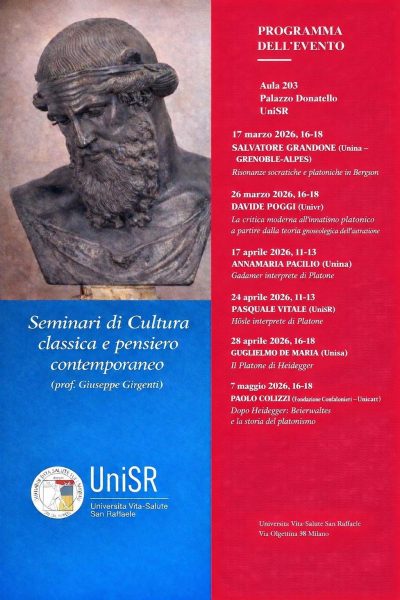Il ciclo di seminari “Platone nel ’900”, promosso dal prof. Giuseppe Girgenti, professore di Storia della filosofia antica presso l’Università Vita-Salute San Raffaele, e coadiuvato dal prof. Pasquale Vitale (PhD UniSr) si inserisce nell’ambito del corso universitario “Cultura classica e pensiero contemporaneo”.