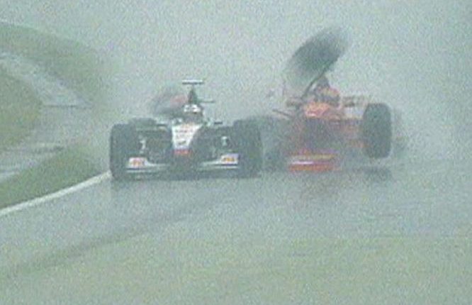 Il giro dopo, Schumacher si appresta a doppiare Coulthard, il quale aveva problemi ed era già andato ai box. Nel rettifilo in discesa verso Pouhon, la McLaren rallenta bruscamente su un tratto molto bagnato ed il ferrarista, uscito dalla curva in piena e con la visibilità ridotta per via dell’acqua generata dalle ruote della vettura dello scozzese, tampona l’avversario. Il tedesco completa il giro fino ai box su tre ruote, mentre Coulthard resta senza alettone posteriore. Appena sceso dalla Ferrari Michael Schumacher – visibilmente arrabbiato – stacca il volante dalla sua monoposto buttandolo contro il bancone del box e si precipita al box McLaren, insultando Coulthard ed accusandolo di aver persino tentato di ucciderlo. La rissa viene scongiurata dall’intervento dei meccanici McLaren che li tengono separati, poi il tedesco viene portato via da Jean Todt e Srefano Domenicali. Gli steward, non ravvisando frenate da parte dello scozzese, non danno seguito a sanzioni disciplinari. Cinque anni dopo, il pilota McLaren ammetterà la propria responsabilità nell’incidente. Il momento nero della Ferrari in Belgio continua con Irvine che esce di strada.