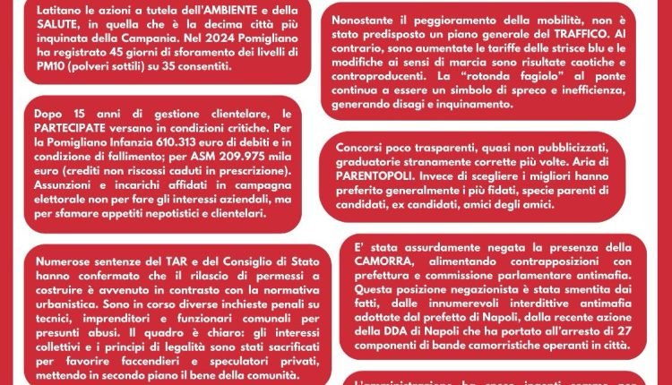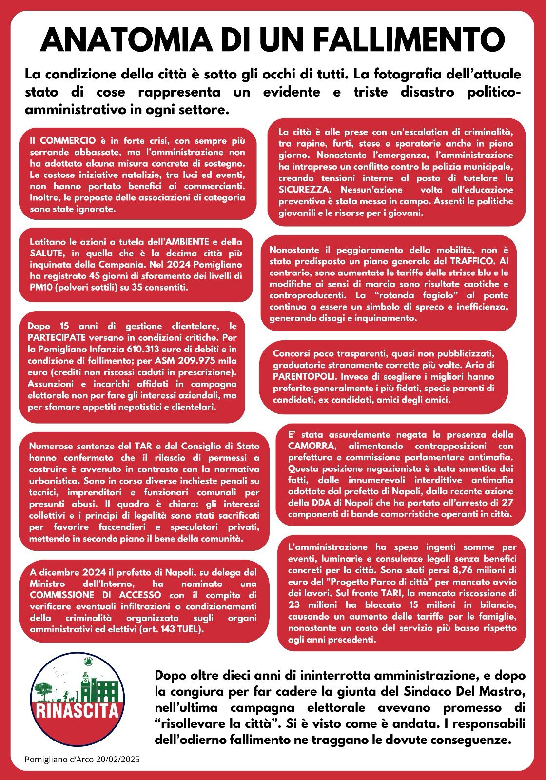 Rinascita, inoltre, ricorda ai cittadini che «a dicembre 2024 il prefetto di Napoli, su delega del Ministro dell’Interno, ha nominato una Commissione D’Accesso con il compito di verificare eventuali infiltrazioni o condizionamenti della criminalità organizzata sugli organi amministrativi ed elettivi» l’attività di questa commissione si concluderà a metà marzo, salvo proroghe.