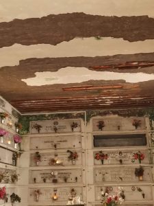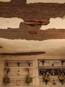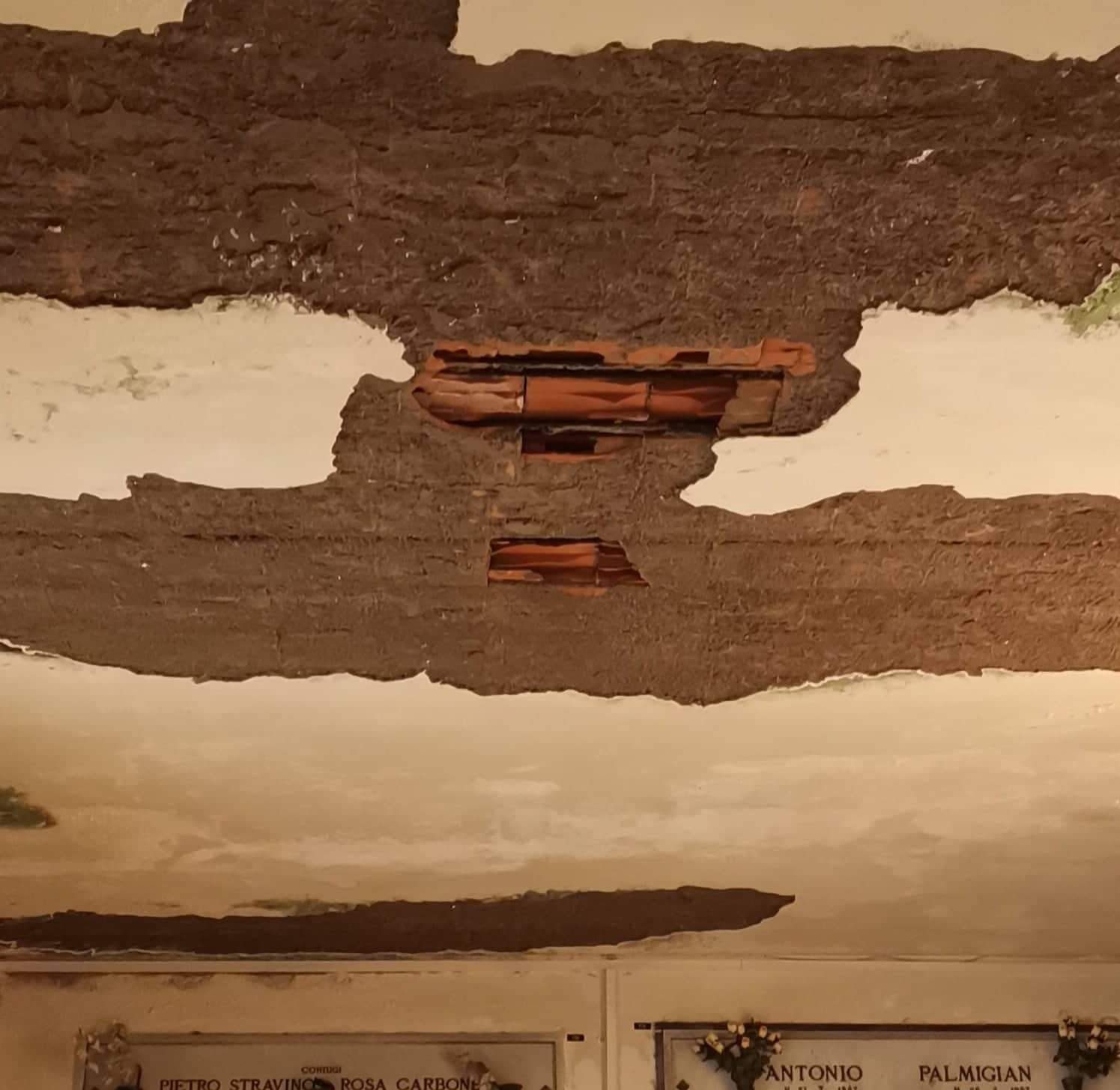 Le foto mostrano un solaio dal quale è caduto l’intonaco, probabilmente a causa di infiltrazioni dall’alto. Una situazione non certo recente, ci dicono, ma che perdura da tempo. Servirebbe, prima che la situazione peggiori fino a diventare irreparabile, un intervento di manutenzione per rendere sicuro e dignitoso un luogo che merita rispetto più degli altri.