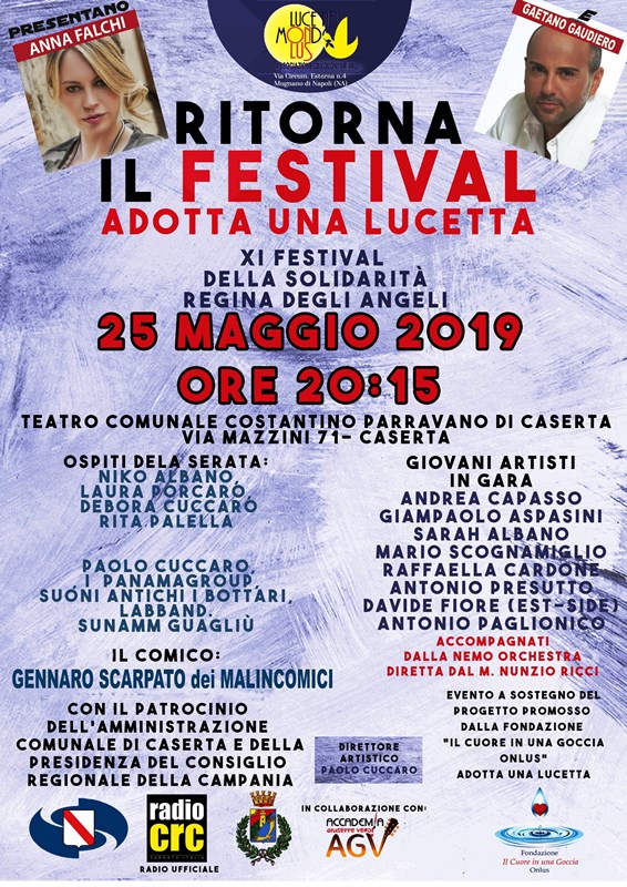 È tutto pronto per dare inizio all’11^ edizione del Festival della Solidarietà “Regina degli Angeli” che, come di consuetudine , viene ospitato nella città di Caserta presso l’accogliente teatro “Costantino Parravano”. L’iniziativa si terrà sabato 25 maggio 2019, con inizio alle ore 20,15. A condurre il Festival, grazie alla promozione e condivisione del progetto da parte di RADIO CRC TARGATO ITALIA, ci saranno Anna Falchi, attrice, modella e presentatrice di fama internazionale ed ora anche apprezzatissima conduttrice radiofonica e l’eclettico Gaetano Gaudiero, speaker di Radio CRC, attore, cantante, opinionista RAI, con la direzione artistica del cantautore Paolo Cuccaro.