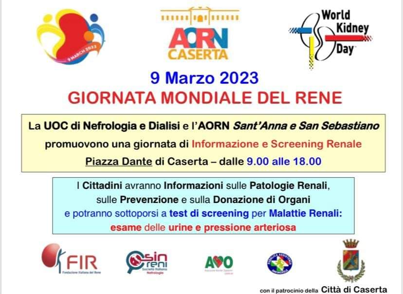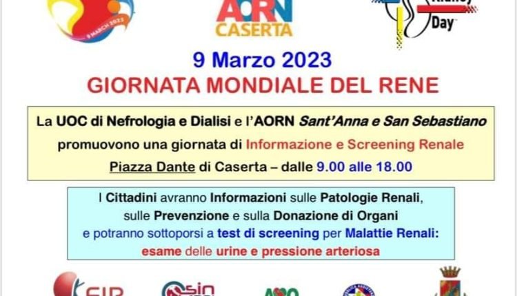 La prevenzione della malattia renale cronica è il concetto ispiratore della campagna di sensibilizzazione e informazione alla cittadinanza con screening nefrologico gratuito, che l’Azienda Ospedaliera di Rilievo Nazionale e di Alta Specializzazione “Sant’Anna e San Sebastiano” di Caserta realizzerà, giovedì 9 marzo, in piazza Dante, aderendo alla Giornata Mondiale del Rene, istituita dalla Società Italiana di Nefrologia e dalla Fondazione Italiana del Rene.