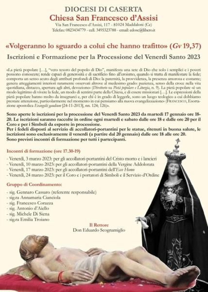 Il gruppo di coordinamento, di cui è responsabile il sig. Gennaro Cassaro rende noto i giorni dedicati alle iscrizioni. Martedì e sabato per il coro e per i simboli, vnerdì per gli accollattori.