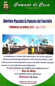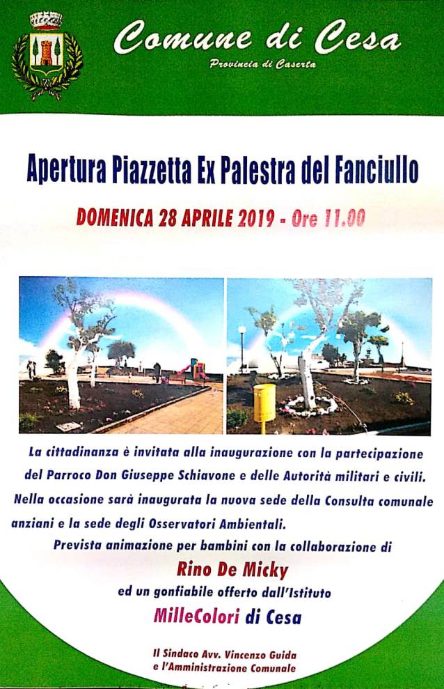 Domenica 28 aprile 2019, con inizio alle ore 11.00, si inaugura a Cesa l’apertura della piazzetta dell’ex Palestra del Fanciullo. Per l’occasione sarà anche inaugurata la nuova sede della Consulta Anziani e degli Osservatori Ambientali. Interverranno il sindaco di Cesa, Enzo Guida, amministratori comunali, il parroco don Giuseppe Schiavone, autorità civili e militari.