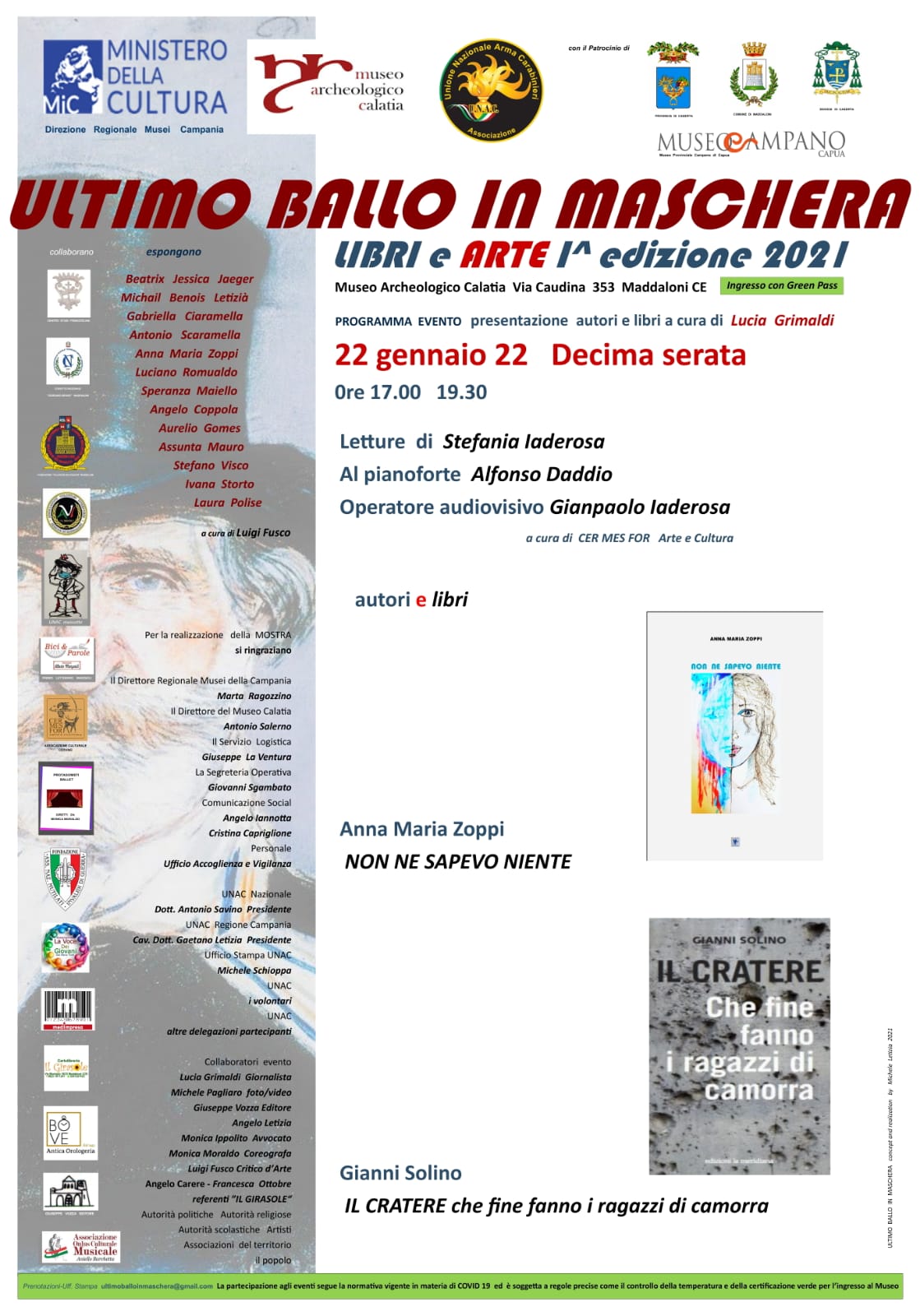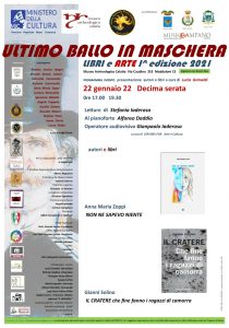 In occasione della decima serata della rassegna si avrà la possibilità all’inizio di assistere alla Performance di Letture di Stefania Iaderosa con al pianoforte Alfonso Daddio ed operatore audiovisivo Gianpaolo Iaderosa, il tutto a cura di CER MES FOR Arte e Cultura. A seguire la Presentazione Autori e libri con Anna Maria Zoppi che presenta NON NE SAPEVO NIENTE Gianni Solino che presenta IL CRATERE che fine fanno i ragazzi di camorra.