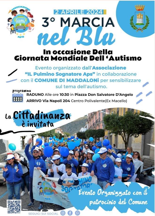 Il 2 aprile, per la giornata mondiale dell’autismo,si terrà la terza edizione della “Marcia nel blu” che partirà da piazza Don Salvatore D’Angelo a Maddaloni alle ore 10:30 e arriverà nella sede della nostra associazione sita in via Napoli 204 per poi inaugurare la nuova stanza con rinfresco finale