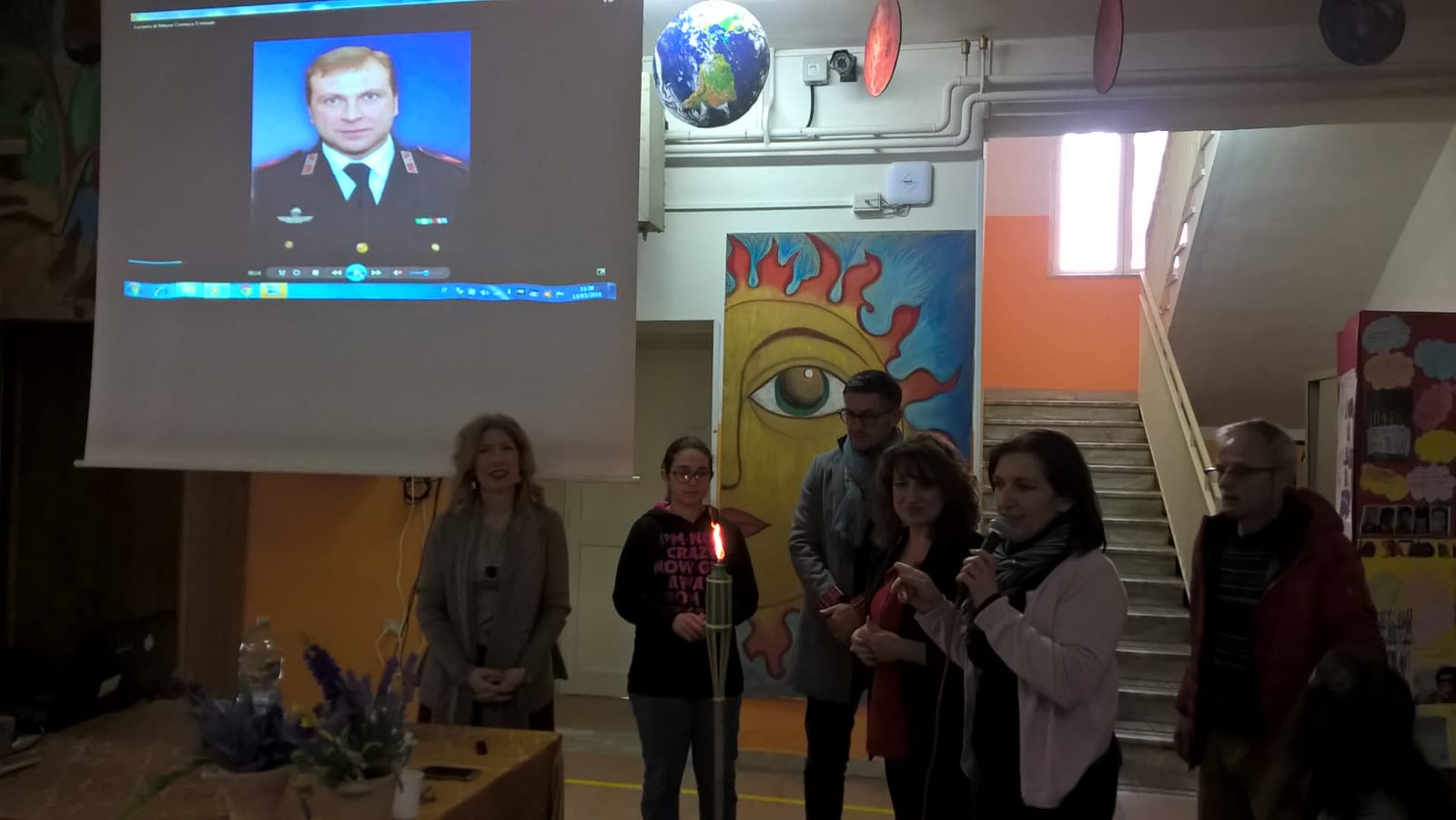 INFINE, LUCIANA DI MAURO, INSIEME A DUE STUDENTESSE, ACCENDE LA FIACCOLA DELLA LEGALITÁ, SIMBOLO DELLA LUCE, DEL BENE, DELLA SPERANZA, DELLA RICONCILIAZIONE. CON NOI C’È ANCHE GAETANO MONTANINO, BIONDO, OCCHI AZZURRI, IN DIVISA DA GUARDIA GIURATA, IN FOTO, IN VERITÁ LUI NON È MAI ANDATO VIA, IL SUO SERVIZIO PER LA COMUNITÁ CONTINUA A SVOLGERLO IN MANIERA MAGISTRALE ATTRAVERSO SUA MOGLIE CHE RACCONTA LA SUA STORIA INCREDIBILE NELLE LE SCUOLE DI TUTTA ITALIA.