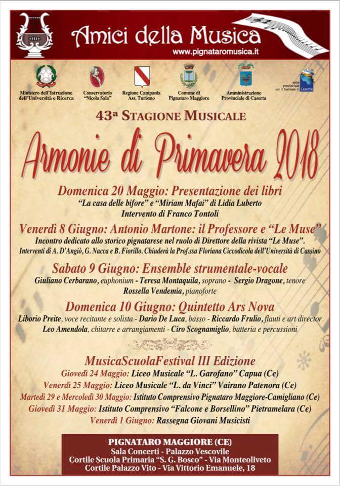 Venerdì 8 giugno, alle ore 19.15, presso il Cortile Palazzo Vito, il Professore e «Le Muse», serata dedicata al Prof. Antonio Martone, già componente del Direttivo degli Amici della Musica, nonché Direttore de Le Muse; interverranno Gianni Nacca, Antonio DAngiò, Bartolomeo Fiorillo e la Prof.ssa Floriana Ciccodicola dellUniversità di Cassino. Spazio alla musica, sabato 9 giugno, alle ore 19.30, nella Sala Concerti con lEnsemble vocale-strumentale costituito da Giuliano Cerbarano, eufonio; Teresa Montaquila, soprano; Sergio Dragone, tenore; Rossella Vendemia, pianoforte. Le Armonie di Primavera si chiudono domenica 10 giugno, alle ore 19.30, nella Sala Concerti, con il Quintetto Ars Nova – che proporrà un programma di musiche di Renato Carosone – formato da: voce recitante e solista: Liborio Preite; basso: Dario De Luca; batteria e percussioni: Ciro Scognamiglio; flauti e art diretctor: Riccardo Frulio; Chitarre e Arrangiamenti: Leo Amendola. Gli Amici della Musica di Pignataro Maggiore promuovono inoltre la terza edizione del MusicaScuolaFestival, una Rassegna di sei appuntamenti dedicati agli studenti di musica. Linaugurazione della Rassegna Giovanile, giovedì 24 maggio, è affidata ai ragazzi del Liceo Musicale L. Garofano di Capua (Ce). A seguire, venerdì 25 maggio, lesibizione dellOrchestra del Liceo Musicale Leonardo da Vinci di Vairano Patenora (Ce). Si proseguirà, martedì 29 maggio e mercoledì 30 maggio, con gli studenti dellIstituto Comprensivo Pignataro Maggiore-Camigliano (Ce). Giovedì 31 maggio sarà la volta dellOrchestra dellIndirizzo Musicale Istituto Comprensivo Falcone e Borsellino di Pietramelara (Ce). La conclusione del MusicaScuolaFestival è affidata, venerdì 1 giugno, ai musicisti pignataresi e dei paesi limitrofi. «Una programmazione densa ed articolata per le Armonie di Primavera – afferma il Presidente Rossella Vendemia – poiché risponde al preciso intento di realizzare cartelloni sempre più ricchi in cui dare spazio alla musica, alla letteratura, alla poesia. La terza edizione del MusicaScuolaFestival costituisce una felice conferma della valenza delliniziativa intrapresa, rivolta con particolare specificità a coinvolgere le realtà scolastiche territoriali ed i giovanissimi musicisti».