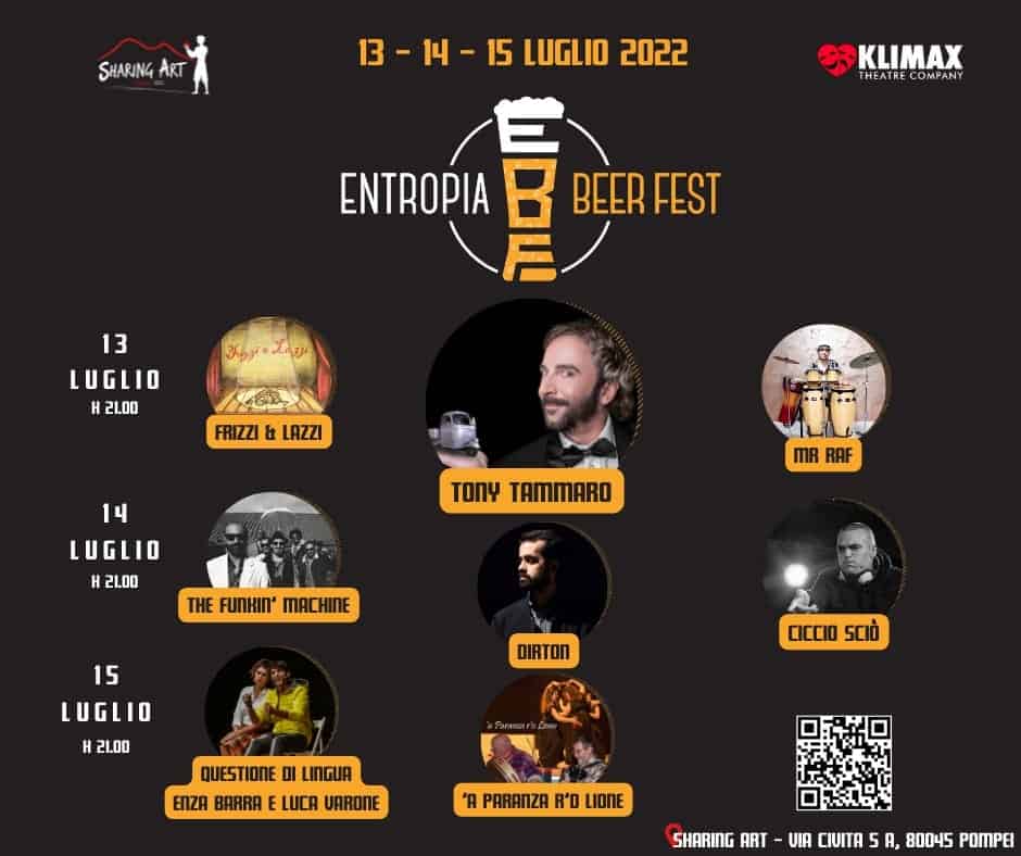 Dal 13 al 15 luglio Sharing Art in collaborazione con Klimax Theatre Company sperimenterà un nuovo format che mette a confronto gli artigiani della birra e gli artisti attraverso l’Entropia Beer Fest. La cotta pubblica, il teatro e la musica, faranno da cornice ad un programma che avrà inizio il 13 luglio con il concerto di Tony Tammaro, Frizzi&Lazzi e Mr Raf. Si prosegue il 14 con The Funkin’ Machine e a seguire il Deejay Dirton e Ciccio Sciò. Il 15 sarà la volta della Cotta pubblica, con la premiazione della migliore Birra artigianale e a seguire lo spettacolo comico “Questione di lingua” di e con Luca Varone e Enza Barra, finendo la serata con ‘A paranza r’o Lione.