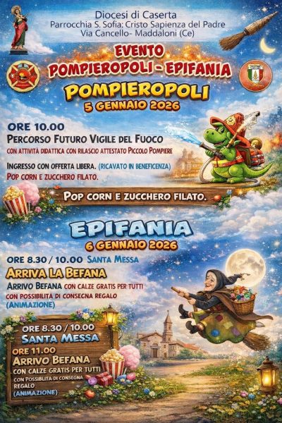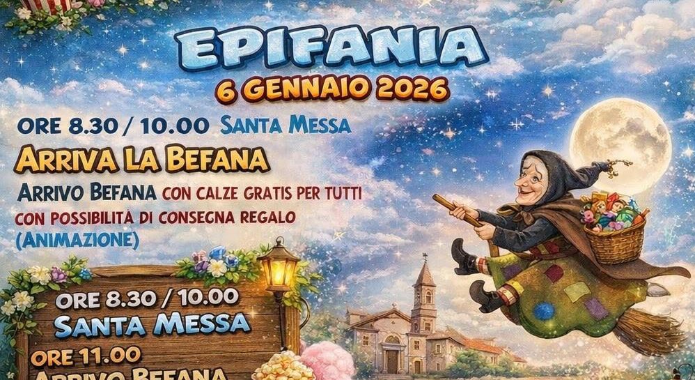 La festa prosegue martedì 6 gennaio, nel giorno dell’Epifania. Dopo le Sante Messe alle ore 8.30 e 10.00, arriverà, attesissima, la nonnina più amata, la Befana. La Befana atterrerà con la sua scopa e il suo sacco stracolmo di calze in via Cancello alle ore 11.00, per distribuire dolcezza a tutti i bambini presenti.