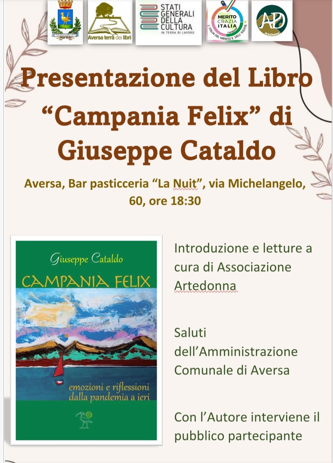 Mercoledì 14 dicembre 2022 ad Aversa presso il bar pasticceria La Nuit, alle ore 18:30 si terrà la presentazione del libro “Campania Felix – emozioni e riflessioni dalla pandemia a ieri” di Giuseppe Cataldo. È una iniziativa dell’Associazione Meritocrazia Italia Campania con l’Associazione Artedonna che rientra nel calendario del Natale ad Aversa ed è inserita nella rassegna “Aversa Terra dei Libri” del Comune di Aversa. “Il libro – dice l’autore – è una sorta di diario (da dicembre 2020 al mese di settembre 2022) che parla delle emozioni provate e della ricerca costante di notizie non propriamente allineate rispetto al vissuto, ma che testimoniano quanta capacità e quante risorse abbia la società nel donare risposte e speranze. Il lettore, in tal modo, è immerso in un viaggio dove ciascuno potrà trovare una meta, una visione dell’insieme che deve tornare a essere comunità. Per farlo, nel testo sono stati mostrati modelli positivi da emulare, sono state esaltate le grandi bellezze nazionali e campane, le opportunità che spesso passano silenti sotto i nostri occhi e che non riusciamo pienamente a cogliere”. La presentazione del libro è stata pensata come un incontro in cui al centro ci fossero le idee e le proposte della gente: con l’autore infatti dialogherà il pubblico partecipante.