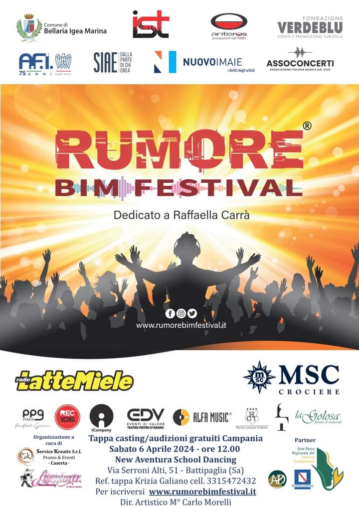 Artedonna è partner dell’edizione 2024 di Rumore Bim Festival, contest nazionale dedicato a Raffaella Carrà che parte dal Comune di Bellaria – Igea Marina. L’obiettivo è selezionare nuovi talenti per il mondo dello spettacolo (musica, ballo, canto, teatro, ecc. ). Non ci sono limiti di età. Si vincono borse di studio e opportunità professionali.