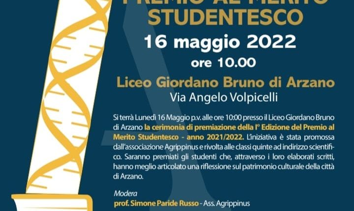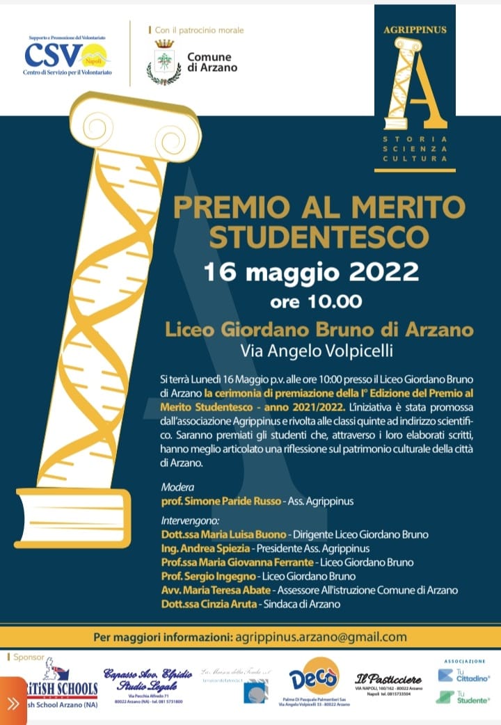 Arzano-Il premio al merito studentesco, ideato da una commissione interna all’associazione Culturale Agrippinus di Arzano, nasce per approfondire e al contempo stimolare la conoscenza del patrimonio storico del suddetto comune e instillare nelle nuove generazioni  la conoscenza identitaria del piccolo comune al Nord di Napoli. Il prof. Simone Paride Russo spiega così la nascita e l’obiettivo di tale premio: <<È una scelta assolutamente imperativa quella di promuovere la cultura del proprio luogo d’origine, in quanto è la storia locale  e la sua conoscenza a creare lo spirito di comunità. Ricordare e allo stesso tempo promuovere>>. Partecipanti al concorso le classi quinte del Liceo Scientifico “Giordano Bruno” di Arzano. La premiazione, prevista per il 16 Maggio nell’aula Magna del Liceo, vedrà coinvolti il Sindaco “C.Aruta”, che conferirà  un premio economico al vincitore e le pubblicazioni storiche dell’Associazione Agrippinus come omaggio ai partecipanti. Saranno presenti, inoltre, diverse personalità della cultura arzanese, i membri della giunta e i Dirigenti scolastici del territorio.