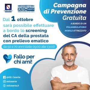 Dal 1° Ottobre, l’iniziativa vedrà la presenza di un ulteriore screening da poter eseguire fra quelli previsti dal programma di prevenzione: si tratta dello screening del CA della prostata – nella fascia di età 50 – 70 anni – con prelievo ematico, per identificare a partire da un elevato valore del PSA (antigene prostatico specifico) la presenza del tumore in fase iniziale e prima dello sviluppo dei sintomi. Il suddetto prelievo non richiede di essere digiuni. Lo screening sarà eseguito a bordo del camper sanitario dalle ore 9.00 alle 13.00.