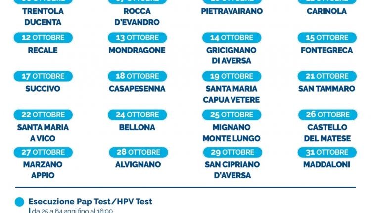 Caserta. “Screening Oncologici in Tour”- la campagna di prevenzione gratuita promossa dall’ASL Caserta – non conosce sosta, ed anche per il prossimo mese di ottobre è già disponibile il nuovo calendario con le tappe che saranno toccate dal camper della salute.
