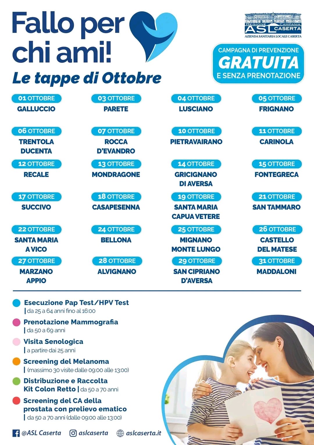 ASL Caserta/“Screening Oncologici in Tour”, le tappe di Ottobre per partecipare ai prossimi appuntamenti in programma