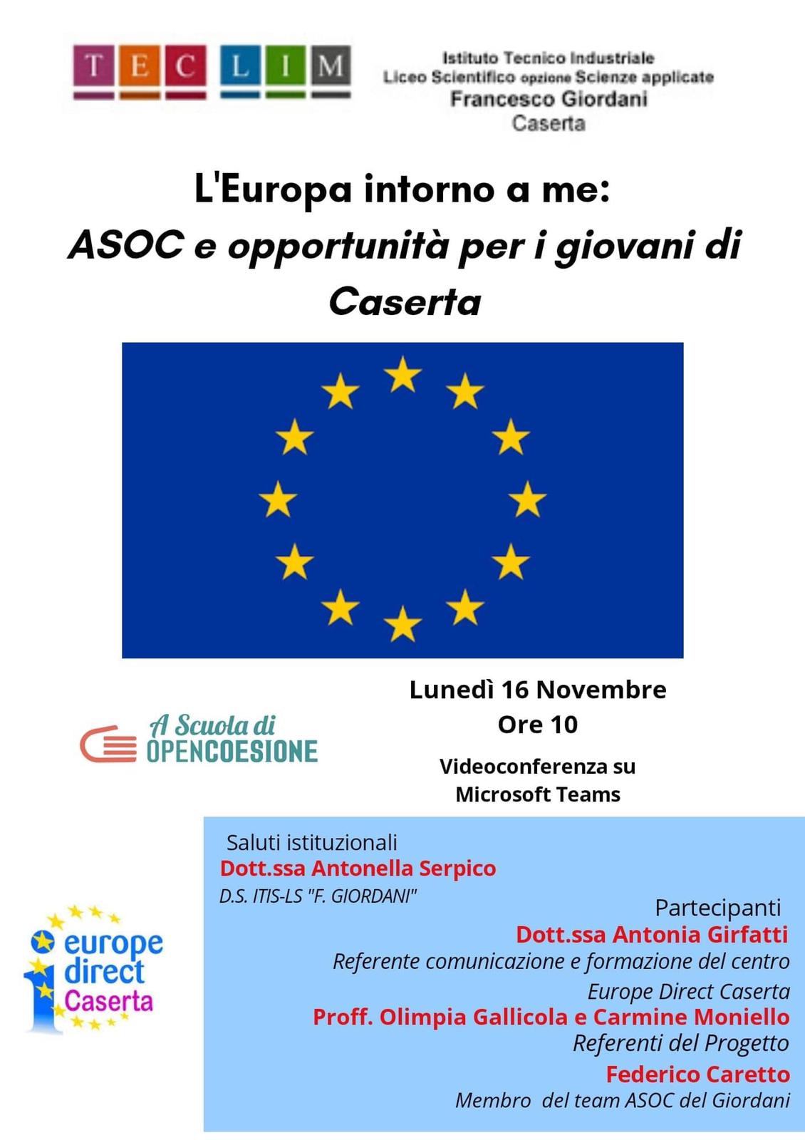 Tale evento sarà online e coinvolgerà rappresentanze di studenti di tutte le altre scuole superiori dell’Ambito Territoriale di riferimento. Il seminario offrirà agli studenti del territorio provinciale di Caserta l’opportunità di potenziare la consapevolezza del loro essere cittadini europei e la conoscenza dei loro diritti. L’incontro sarà strutturato in modo tale da fornire tutte le informazioni e news delle istituzioni europee e anche sulle opportunità dei Programmi di mobilità transnazionale e della Politica di Coesione. Infine si effettueranno alla luce del dibattito dei laboratori che renderanno i ragazzi protagonisti e capaci di seguire e di usufruire dei canali, piattaforme e dei portali della Commissione europea a loro dedicati.