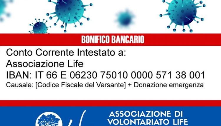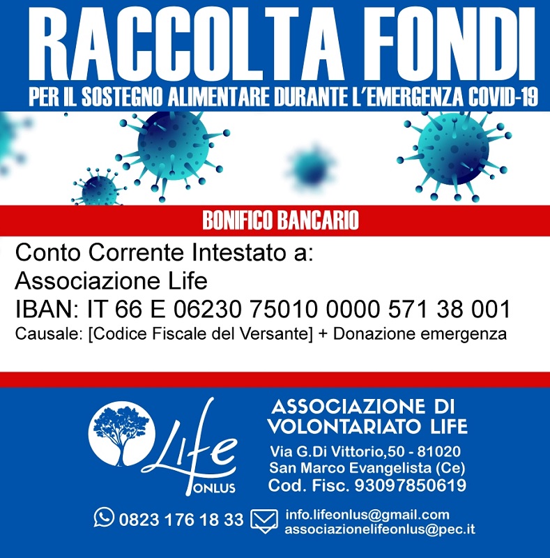 Anche noi come “Life ODV” (già “Life Onlus”), con sede a San Marco Evangelista, in provincia di Caserta, abbiamo voluto lanciare questa campagna dove è possibile donare a questo l’Iban: *IT 66 E 06230 75010 0000 571 38 001. Intestato a ASSOCIAZIONE LIFE.