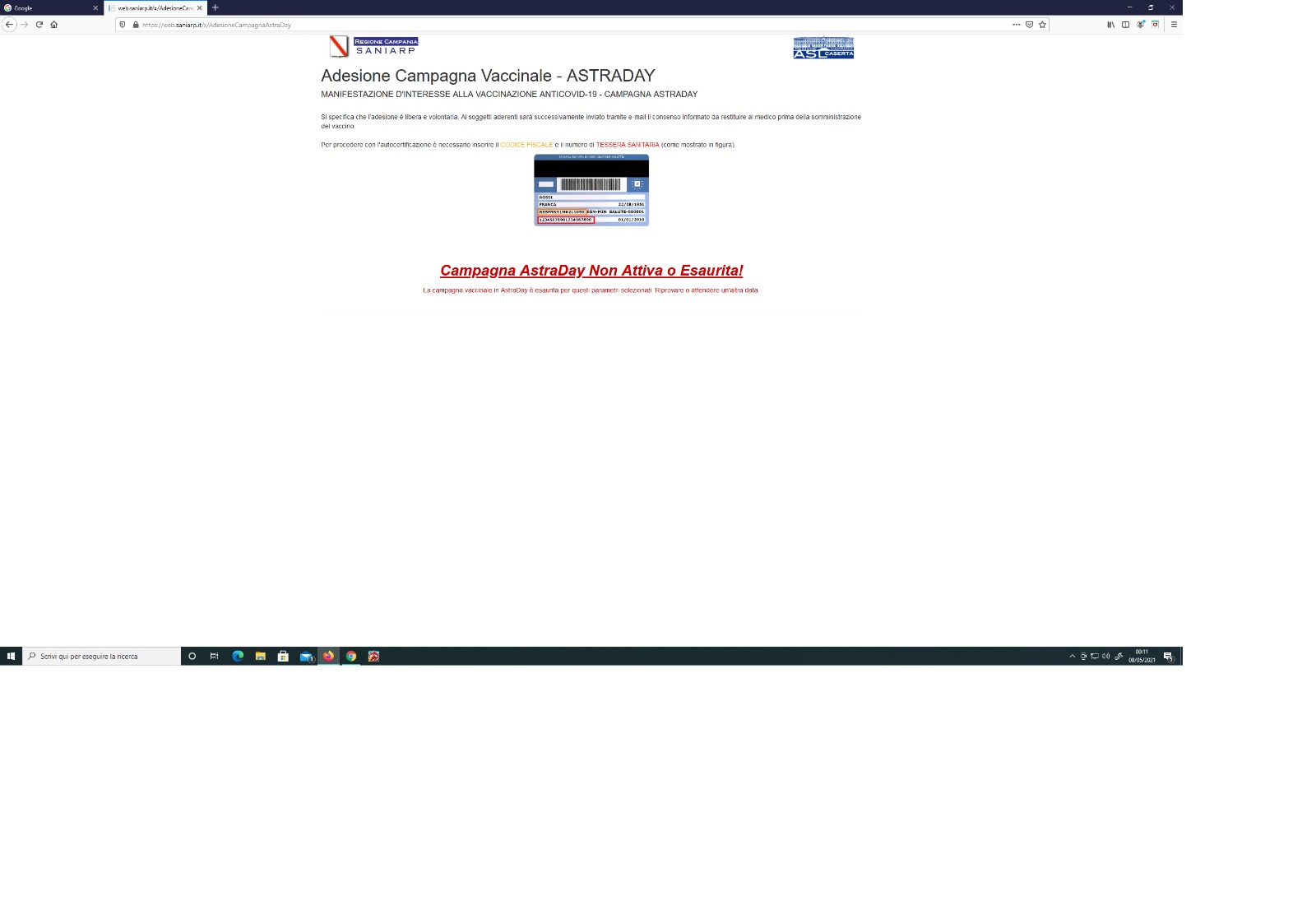 Caserta. L’open day organizzato dall’ASL di Caserta alla caserma Ferrari Orsi di Caserta si rivela un grande bluff. Ci arrivano varie segnalazioni da diversi utenti che a mezzanotte in punto, come da indicazioni, hanno provato invano a prenotarsi. Il server in tilt dopo solo un minuto con l’errore http 503 che indica il servizio non disponibile. E come si vede dallo screenshot che segue, dopo dieci minuti prenotazioni esaurite.