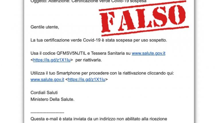 Se hai ricevuto un’email con oggetto “Attenzione: Certificazione verde Covid-19 sospesa”, inviata da “ministerodellasalute.pro.it”, NON proviene dal Ministero della Salute, ma si tratta di un tentativo di #phishing.