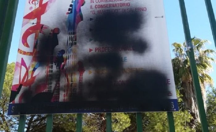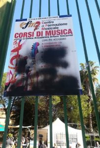 “Sabato, 15 febbraio 2020” – ci ha informato il Presidente del CFM – “per l’ennesima volta abbiamo subito un atto spiacevole e deliberato verso la nostra accademia. In sintesi, qualsiasi manifesto o banner pubblicitario che noi mettiamo, dopo pochi giorni viene rimosso o imbrattato. Ad esempio” – ha aggiunto Bruno Persico – “il banner imbrattato che si vede nella foto allegata lo avevamo messo sul cancello d’ingresso della Villa Comunale e molto in alto. E per farlo abbiamo dovuto usare una scala perché per ben due volte nello stesso posto c’è lo avevano rimosso, guarda caso solo il nostro.