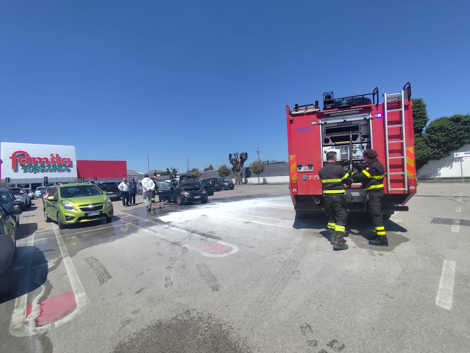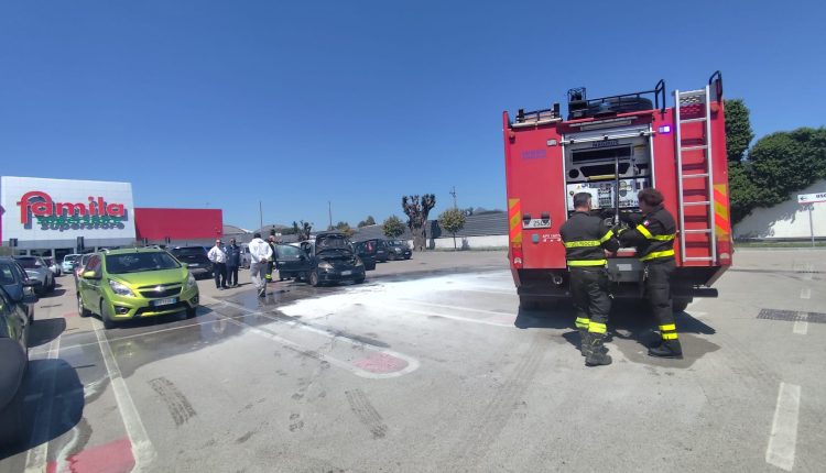 Alcuni clienti, all’uscita del supermercato, hanno notato fumo e fiamme da un’autovettura parcheggiata, ed hanno subito lanciato l’allarme all’interno.