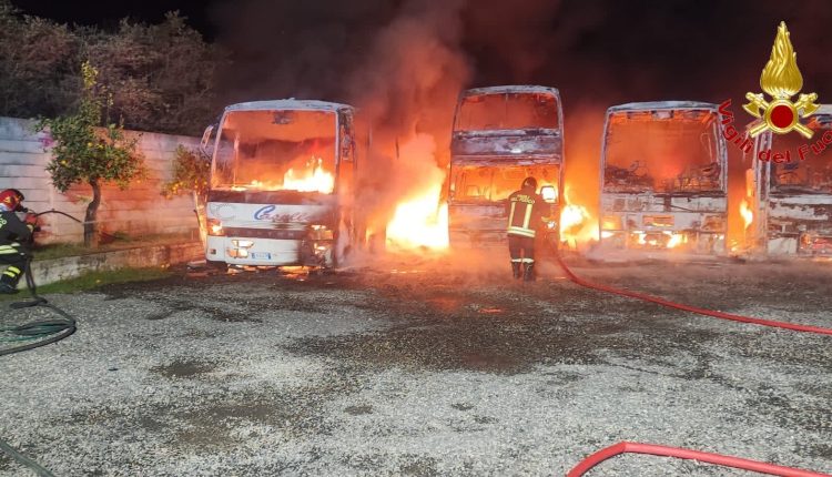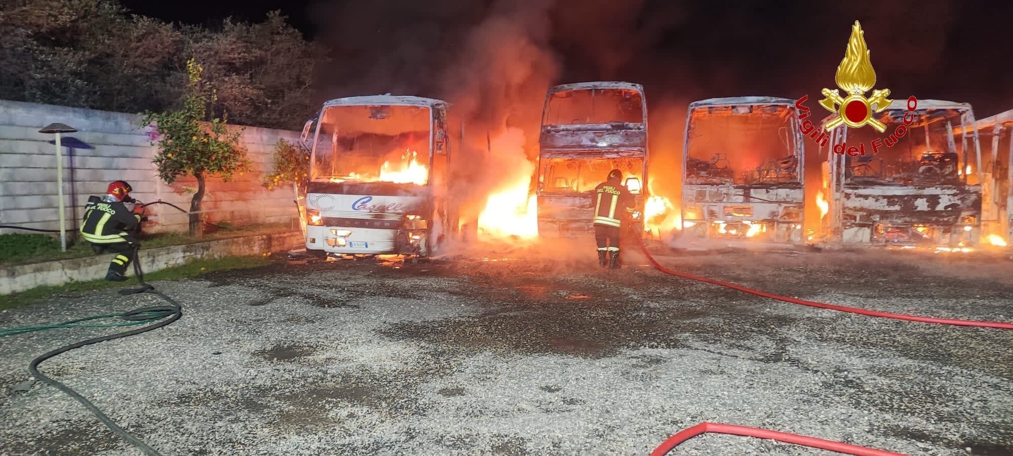 Questa notte, verso le ore 02:00, una squadra dei Vigili del Fuoco del comando provinciale di Caserta, proveniente dalla sede centrale del Comando, è intervenuta in via Latina nel comune di Pastorano all’ertati dai residenti nella zona che vedevano del fumo alzarsi da un’area parcheggio per autobus. Immediatamente Giunti sul posto i Vigili del Fuoco hanno dovuto spegnere un incendio che aveva interessato vari autobus fermi in un deposito di circa 1.800 mq. Per spegnere il vasto incendio, caratterizzato da otto autobus completamente in fiamme, sul posto è stato necessario fare intervenire anche la squadra dal distaccamento dei vigili del fuoco di Teano e due autobotti, una proveniente dal distaccamento di Aversa e una proveniente dalla sede centrale del Comando. Le operazioni di spegnimento sono durate circa cinque ore.La