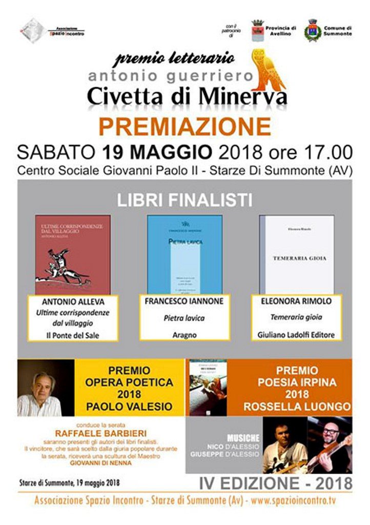 AVELLINO – Giunge a conclusione la quarta edizione del Premio “Civetta di Minerva – Antonio Guerriero”: sabato 19 maggio 2018, alle ore 17.00, presso il Centro sociale “Giovanni Paolo II” di Starze di Summonte (in provincia di Avellino), si terrà la cerimonia di premiazione con la presentazione dei tre finalisti, scelti tra 44 opere edite partecipanti, e la scelta del vincitore del primo premio. Dopo la Giuria Tecnica, che ha selezionato le opere finaliste, sarà ora la Giuria Popolare, composta da 20 persone di diversa età e formazione, a decretare il vincitore del Premio “Civetta di Minerva – Antonio Guerriero”, promosso dall’Associazione “Spazio Incontro” presieduta da Ornella Adiglietti, con il patrocinio morale della Provincia di Avellino e Comune di Summonte. Il vincitore riceverà una scultura del maestro Giovanni Di Nenna. All’evento saranno presenti gli autori dei libri finalisti: Antonio Alleva, Ultime corrispondenze dal villaggio, Il ponte del sale, 2016; Francesco Iannone, Pietra lavica, Aragno, 2016; Eleonora Rimolo, Temeraria gioia, Giuliano Ladolfi Editore, 2017; la targa per il Premio Irpinia, sarà consegnata a Rossella Luongo per il libro “Ieri e domani” (Edizioni Ensemble, 2017). Attesa la presenza di Paolo Valesio, poeta e studioso di letteratura tra i più autorevoli del panorama internazionale, a cui è stato assegnato il Premio Opera Poetica. Saranno consegnate anche le pergamene ai segnalati presenti: Ferruccio Brugnaro, Le follie non sono più follie, Pellicano, 2017; Manuel Cohen, Tutte le voci, Arcipelago Itaca, 2016; Vincenzo D’Alessio, Dopo l’inverno e altre poesie, Fara editore, 2017; Anna Elisa De Gregorio, Un punto di biacca, La vita felice, 2016; Annamaria Ferramosca, Andare per salti, Arcipelago Itaca, 2017; Anna Marchitelli, Certe stanze, Manni, 2017; Evaristo Seghetta Andreoli, Paradigma di esse, Passigli, 2017; Antonio Spagnuolo, Non ritorni, Robin edizioni, 2016. Saranno presenti le autorità e i membri della Giuria Tecnica, presieduta da Domenico Cipriano e composta da Raffaele Barbieri, Cosimo Caputo, Francesco Filia e Carlangelo Mauro, che ha scelto i finalisti nella prima fase del premio. La Giuria Popolare sarà invece composta da Masiello Gerardo Nicola (Presidente), Matarazzo Anna Sarah, Carullo Fiorenzo, Cucciniello Stefano, Dello Russo Carmine, Pasquale Assuntina, Cucciniello Angela, Di Pietro Fausto, Di Sapio Antonio, Dello Russo Caterina, Tirri Marika, Eleuterio Tommaselli, Ercolino Carmela, Tangredi Sara, Francesca Ferulli, Dello Russo Virginia, Bordone Livia, Giordano Giuseppe, Riccardi Marika, Della Sala Ersilia. A presentare la cerimonia di premiazione sarà Raffaele Barbieri, nelle scenografie allestite da Bianca Pacilio. La lettura delle poesie poesia sarà affidata agli stessi poeti finalisti, mentre le musiche al duo jazz composto dai fratelli Nico e Giuseppe D’Alessio. Sarà possibile seguire l’evento su Twitter con l’hashtag #civetta2018. L’obiettivo del concorso letterario è dare la possibilità ai cittadini di avvicinarsi al mondo della poesia contemporanea, favorendo la lettura e l’incontro con i protagonisti di un’arte tanto diffusa quanto poco conosciuta. L’Associazione Spazio Incontro è impegnata infatti nel favorire la diffusione della cultura all’interno del territorio della provincia di Avellino. Proprio con questo scopo, dieci anni fa, nasceva l’associazione di volontariato, che ha tra i suoi fondatori proprio Antonio Guerriero, prematuramente scomparso nel 2008, e sempre pronto a prodigarsi per la divulgazione della conoscenza soprattutto a vantaggio dei più giovani.