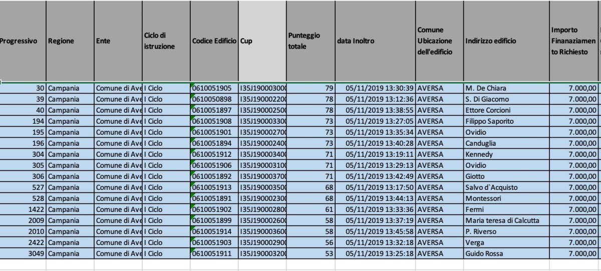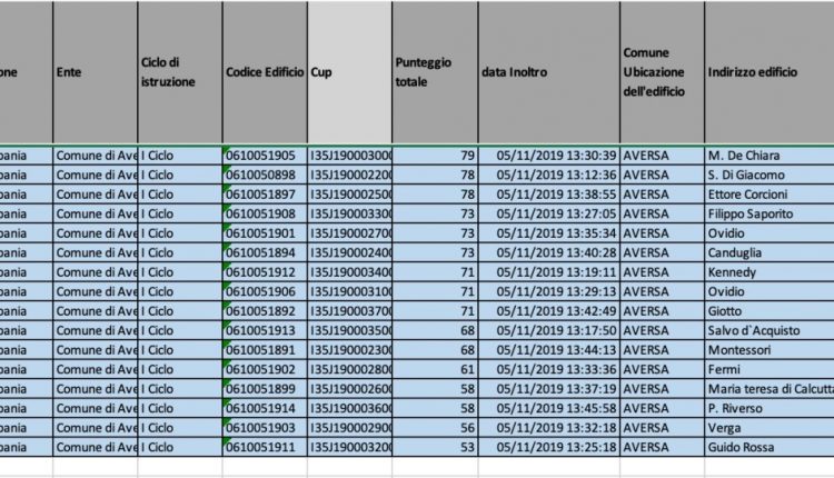 AVERSA – Sono state pubblicate sul sito del Ministero dell’Istruzione le graduatorie del bando da 65,9 milioni di euro per un Piano straordinario per le verifiche dei solai e dei controsoffitti degli edifici pubblici adibiti a uso scolastico e per eventuali interventi urgenti sulle situazioni di criticità che emergeranno dalle indagini. Nello specifico, verranno finanziate 5.560 verifiche. E la Città di Aversa ottiene ben 112 mila euro per verifiche che verranno effettuate in ben 16 istituti scolastici.