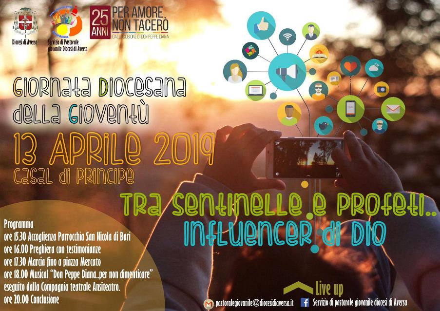 AVERSA – “Tra sentinelle e profeti… influencer di Dio”: è questo lo slogan della Giornata Diocesana della Gioventù che la Chiesa di Aversa vivrà sabato prossimo, 13 Aprile 2019, a Casal di Principe. La scelta della location è dettata dall’inserimento di questo evento diocesano nel percorso della memoria di don Peppe Diana, a venticinque anni dalla sua uccisione per mano della camorra. Le parole “tra sentinelle e profeti” costituiscono un chiaro rimando alla lettera pastorale scritta dal vescovo di Aversa, Mons. Angelo Spinillo, proprio in occasione del 25esimo anniversario celebrato lo scorso 19 marzo.