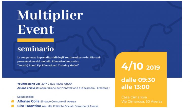 You(th) Stand Up Multiplier Event organizzato dall’Associazione Patatrac (Aversa) in collaborazione con Studio Erresse, Associazione Progettisti Europei – APEUR, Amesci e Amesci International Movement (AIM), Synthesys, Cyclisis, Cantiere Giovani, Festival del Buon Vivere, Liceo Scientifico Statale Nino Cortese (Maddaloni), Comune di Aversa si svilupperà in due momenti: