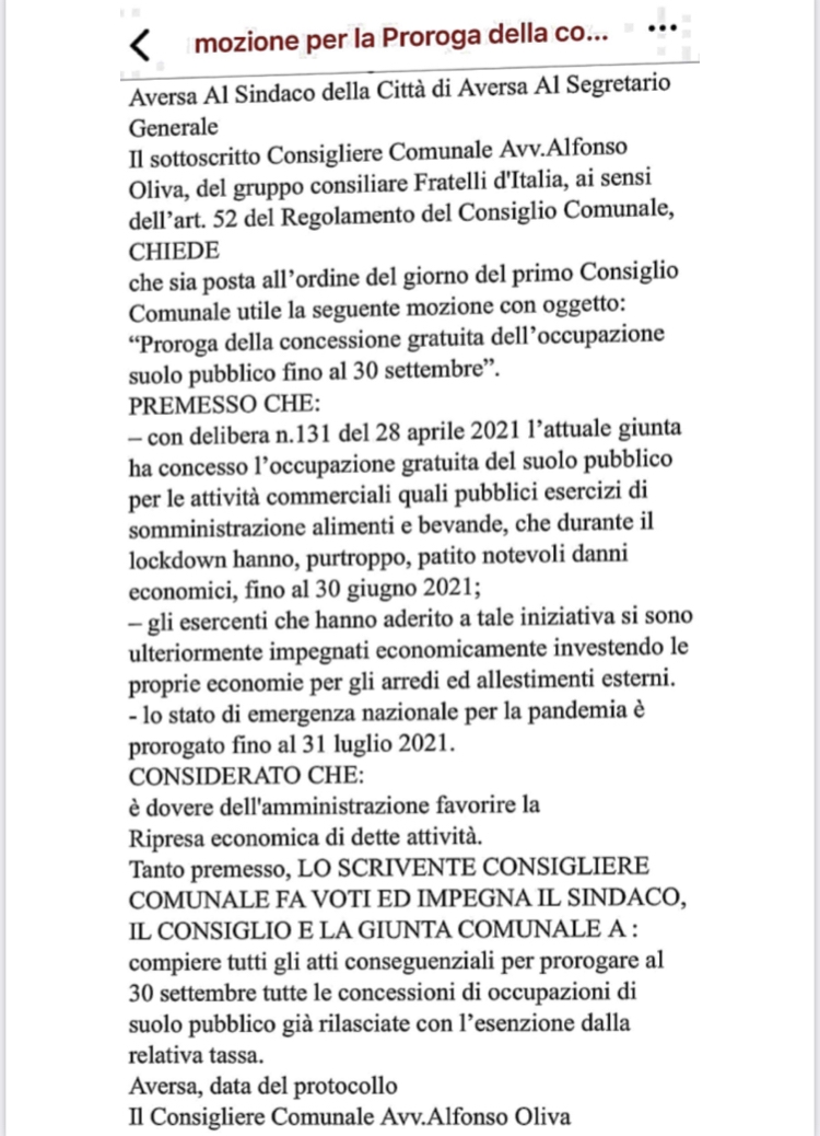 Aversa-Fratelli d’Italia, per il tramite del commissario e consigliere comunale Alfonso Oliva, ha depositato la mozione in linea con quanto proposto nel primo