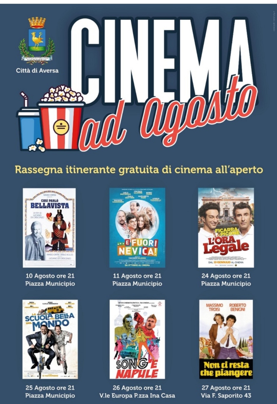 Aversa – Partirà il 10 agosto la rassegna cinematografica ‘Cinema ad agosto’ che il Comune di Aversa ha organizzato in piazza Municipio. Gli appuntamenti sono il 10, 11, 24, 25, 26,27 sempre alle ore 21.00.
