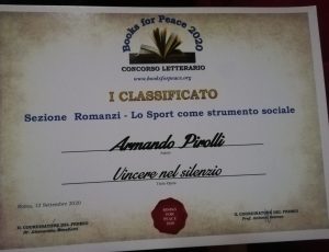 La quarta edizione del Books for Peace 2020 ha avuto come tema portante l’arte e la cultura patologica, l’integrazione e la valorizzazione culturale di tutti coloro che vivono una disabilità o una malattia psichica o fisica. Armando Pirolli ha vinto quest’edizione 2020 con il romanzo biografia “Vincere nel Silenzio” la vita e la storia sportiva di un ragazzo sordomuto di Teverola in provincia di Caserta, edito e curato da Pasquale Gnasso Editore. Madrina della manifestazione Katia Noventa che con tante altre personalità di spicco hanno coadiuvato nelle nomination di questa edizione . Hanno partecipato tra gli altri : Giovanni Improta (campione sordomuto di Kich Box), Franco Di Mare ( RAI ), Amedeo Ricucci ( RAI ), Elena Sofia Ricci ( Attrice ), Sebastiano Somma ( Attore ), Damiano Tommasi ( Presidente AIC ).