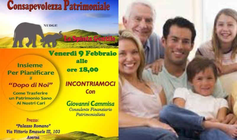 AVERSA – Un nuovo evento prende vita nel cuore di Aversa. Venerdì 9 febbraio 2018, con inizio alle ore 18.00, presso il “Palazzo Romano”, in via Vittorio Emanuele III, ci sarà l’incontro con il consulente finanziario patrimonialista Giovanni Cammisa, in vista del progetto “Consapevolezza Patrimoniale”. Verranno spiegati alcuni temi riguardanti il cosiddetto “Dopo di noi”, ovvero come trasferire un patrimonio sano ai nostri cari. “Un mezzo semplice per comunicare e conoscersi, ma soprattutto per far chiarezza sul complesso mondo della pianificazione successoria – dice Cammisa -. Sia che si partecipi in qualità di erede, sia che si abbia la necessità di programmare il passaggio delle proprie ricchezze, è necessario conoscere quali siano le principali disposizioni in tema di successioni. La programmazione del trasferimento generazionale della ricchezza, rappresenta una parte importante della pianificazione finanziaria e necessita di un’analisi personalizzata che abbracci anche competenze di natura giuridica. Col supporto di una consulenza personalizzata, si potrà individuare la migliore strategia di pianificazione patrimoniale e successoria, affinché – conclude – si possano tutelare sia le risorse accumulate nell’arco della vita sia le persone a noi care”.