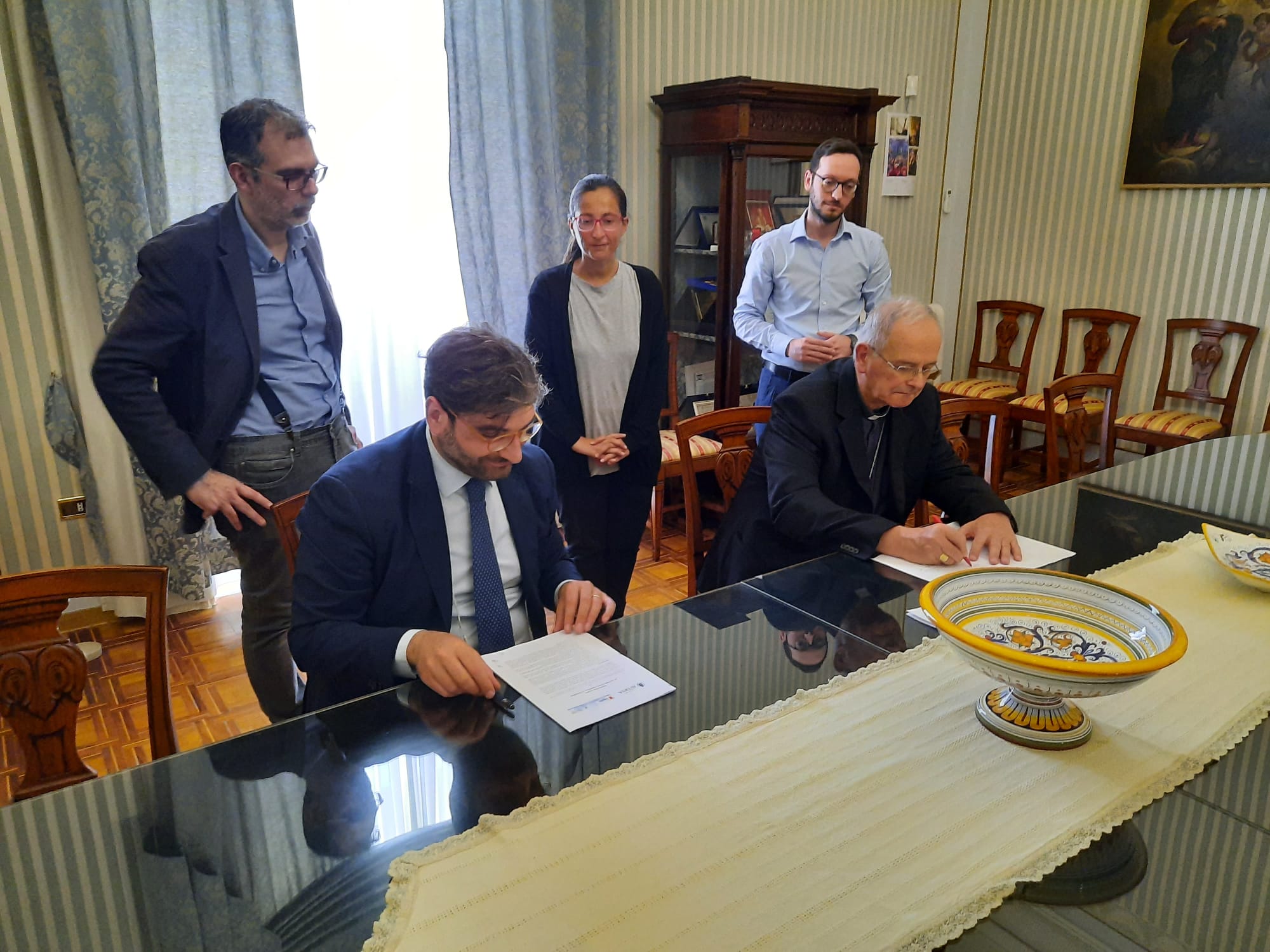 Aversa- Il sindaco di Aversa, Alfonso Golia e il vescovo della Diocesi di Aversa, sua eccellenza mons. Angelo Spinillo, in qualità di presidente dell’associazione culturale e di promozione sociale Eupolis, nel pomeriggio di oggi hanno firmato una convenzione-quadro, della durata di trentasei mesi, dando così il via ufficialmente ad una collaborazione per promuovere forme competenti e sensibili di partecipazione democratica.