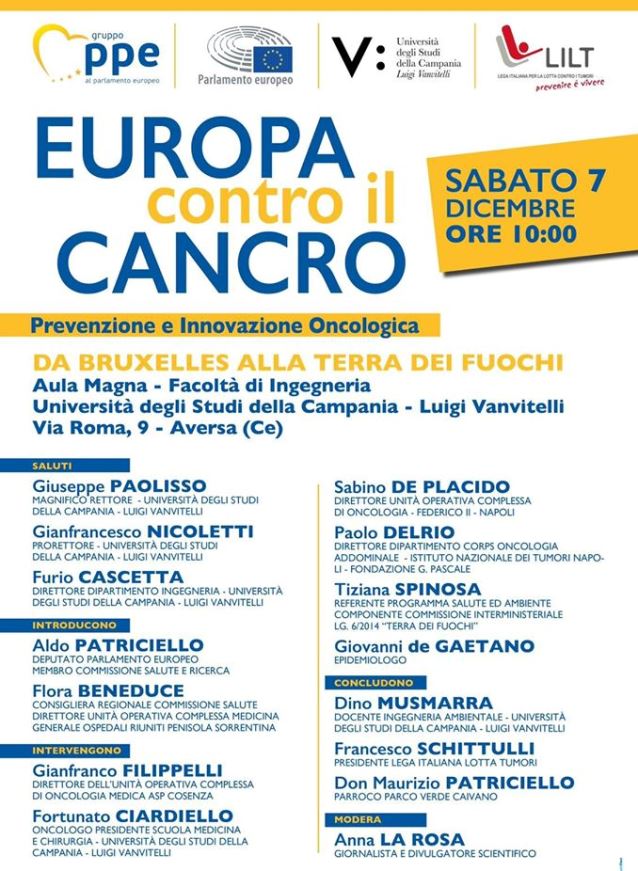AVERSA – Dare risposte ai cittadini. Sulla prevenzione, la diagnosi precoce e le prospettive della clinica contro una patologia che ancora oggi miete quasi un milione e mezzo di vittime all’anno nella sola Europa. Affrontare il problema proprio in una delle zone dove le persone si sentono più vulnerabili: la terra dei fuochi. Sono queste le premesse del convegno “Prevenzione e innovazione oncologica – da Bruxelles alla Terra dei Fuochi”, organizzato dal Gruppo PPE al Parlamento Europeo, che si svolgerà sabato 7 dicembre 2019 ad Aversa.