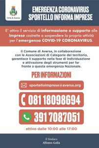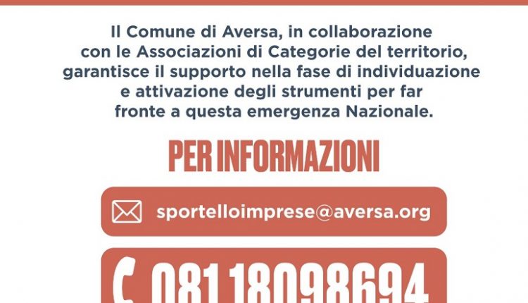Il Comune di Aversa ha istituito uno Sportello per le Imprese al fine di fornire supporto operativo e dare risposte agli operatori del nostro territorio, così da affrontare in modo adeguato l’emergenza COVID-19 e facilitare l’accesso alle agevolazioni in favore dell’economia locale