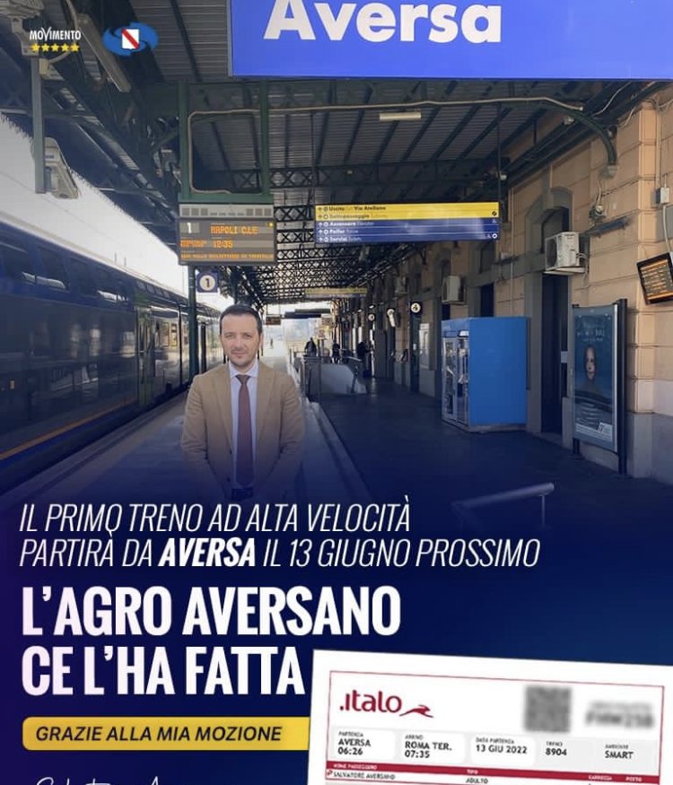 Dal 13 giugno prossimo sarà possibile viaggiare in (AV) “Alta Velocità” dalla stazione di Aversa, non solo in direzione Roma, ma anche verso Firenze, Bologna, Venezia ed altre città.