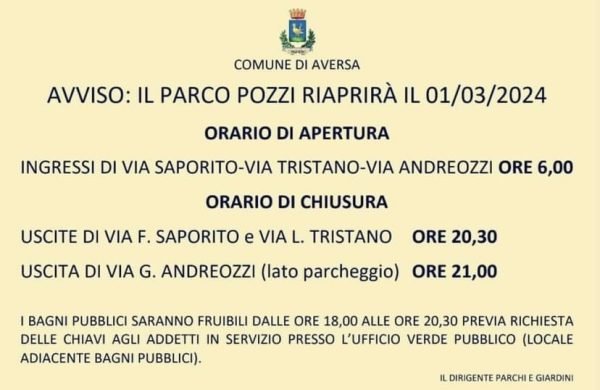 Dopo più di un mese di chiusura, da venerdì 1 marzo il Parco Pozzi riaprirà finalmente al pubblico. Lo rende noto il Comune di Aversa.