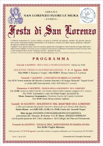 Il culmine delle festività delle Giornate Laurentiane si vivrà lunedì 10 agosto, introdotto però da un corposo programma di appuntamenti di carattere religioso, culturale e sociale curato dal Consiglio Pastorale parrocchiale. Si parte venerdì 7 con il solenne triduo predicato dal sacerdote missionario padre Davide Simionato, rettore del PIME di Ducenta; in serata è previsto l’evento “Musica e Sapori”, organizzato dall’associazione “Amici dell’abbazia di S. Lorenzo” e animato dal Maestro Carmine Esposito e dal Gruppo Musicale” Napoli Nord”, con degustazione di dolci e prodotti tipici aversani (come la Mozzarella, inventata dai Monaci di S. Lorenzo).