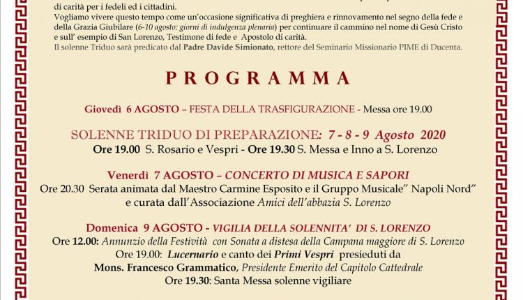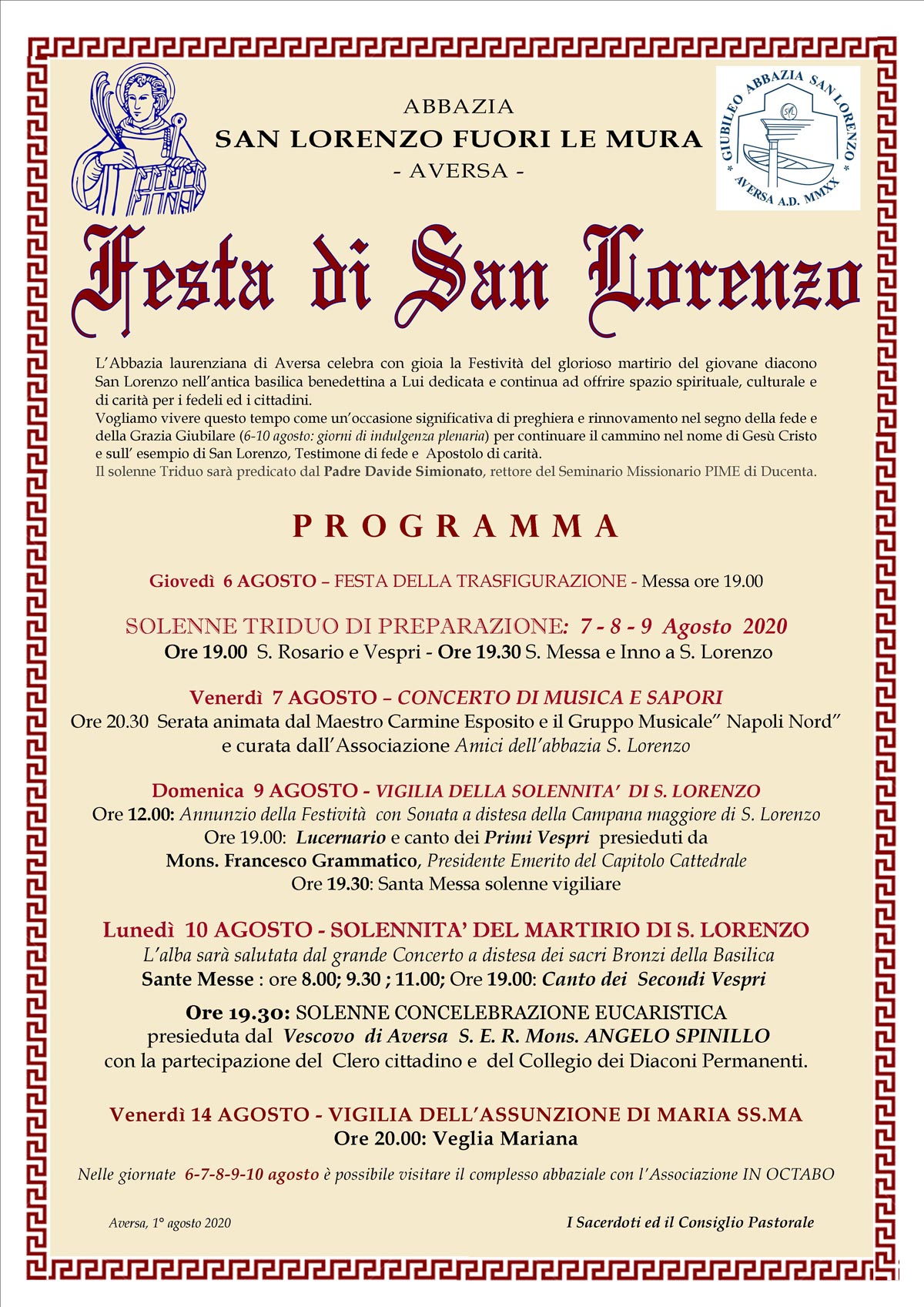Il culmine delle festività delle Giornate Laurentiane si vivrà lunedì 10 agosto, introdotto però da un corposo programma di appuntamenti di carattere religioso, culturale e sociale curato dal Consiglio Pastorale parrocchiale. Si parte venerdì 7 con il solenne triduo predicato dal sacerdote missionario padre Davide Simionato, rettore del PIME di Ducenta; in serata è previsto l’evento “Musica e Sapori”, organizzato dall’associazione “Amici dell’abbazia di S. Lorenzo” e animato dal Maestro Carmine Esposito e dal Gruppo Musicale” Napoli Nord”, con degustazione di dolci e prodotti tipici aversani (come la Mozzarella, inventata dai Monaci di S. Lorenzo).